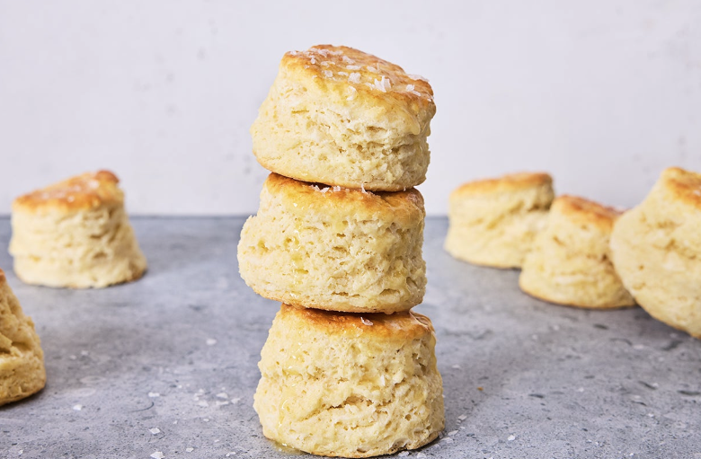 Remove biscuits from the oven and immediately brush with melted butter and sprinkle with flaky salt. Serve warm.
