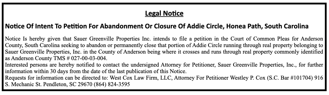 Legal Notice: Notice Of Intent To Petition For Abandonment Or Closure Of Addie Circle, Honea Path, South Carolina