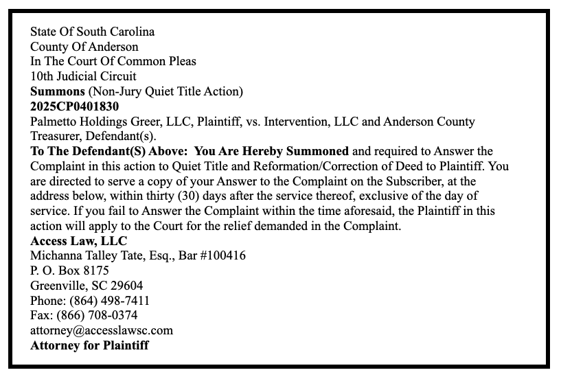 Legal Notice: Palmetto Holdings Freer, LLC vs. Intervention LLC and Anderson County Treasurer