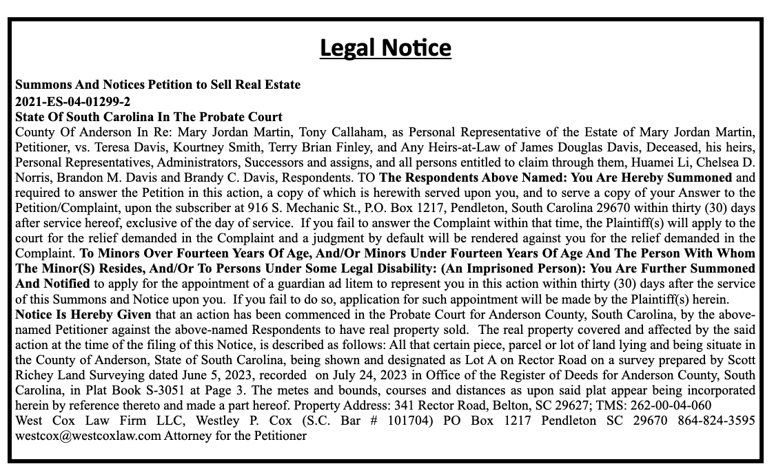 Legal Notice: Mary Jordan Martin, Tony Callham, Personal Representatives of the Estate of Mary Jordan Martin vs. Teresa Davis, Kourtney Smith, Terry Brian Finley, and Any Heirs-at-Law of James Douglas Davis, Deceased, his heirs.