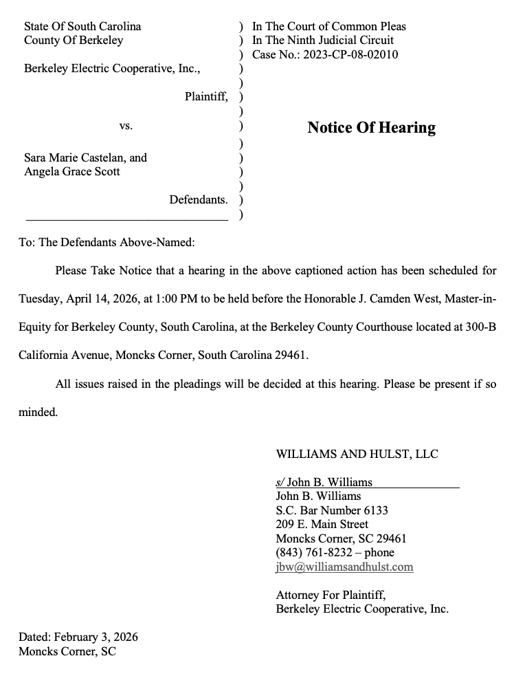 Legal Notice: Berkeley Electric Cooperative, Inc. vs. Sara Marie Castelan and Angela Grace Scott