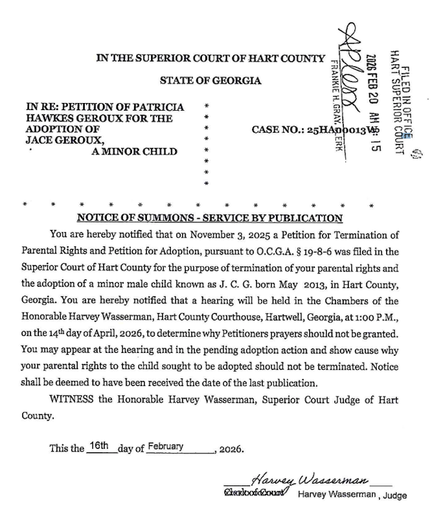 Legal Notice: Petition of Patricia Hawkins Geroux for the adoption of Jace Geroux