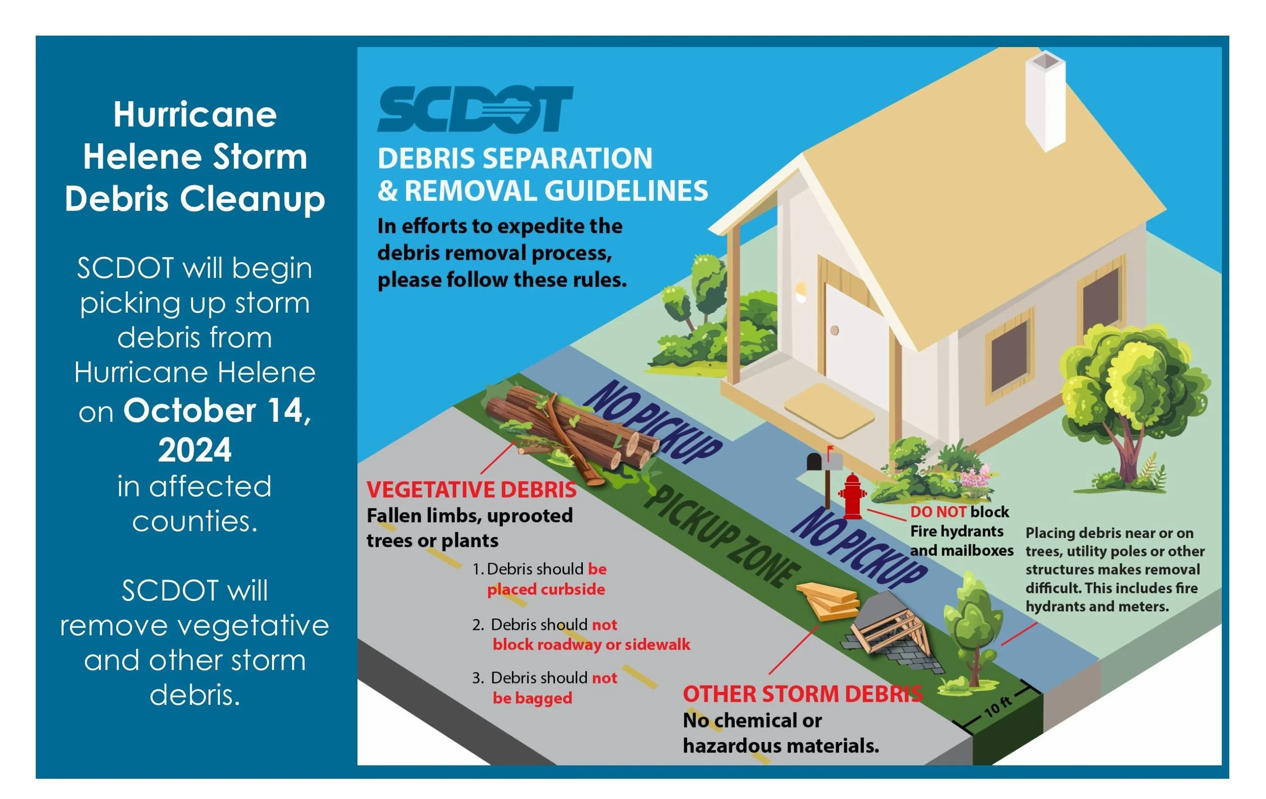 Residents who are having trouble getting debris to the right of way due to limited road frontage or debris blocking the way should call the South Carolina Department of Transportation at 855-467-2368.